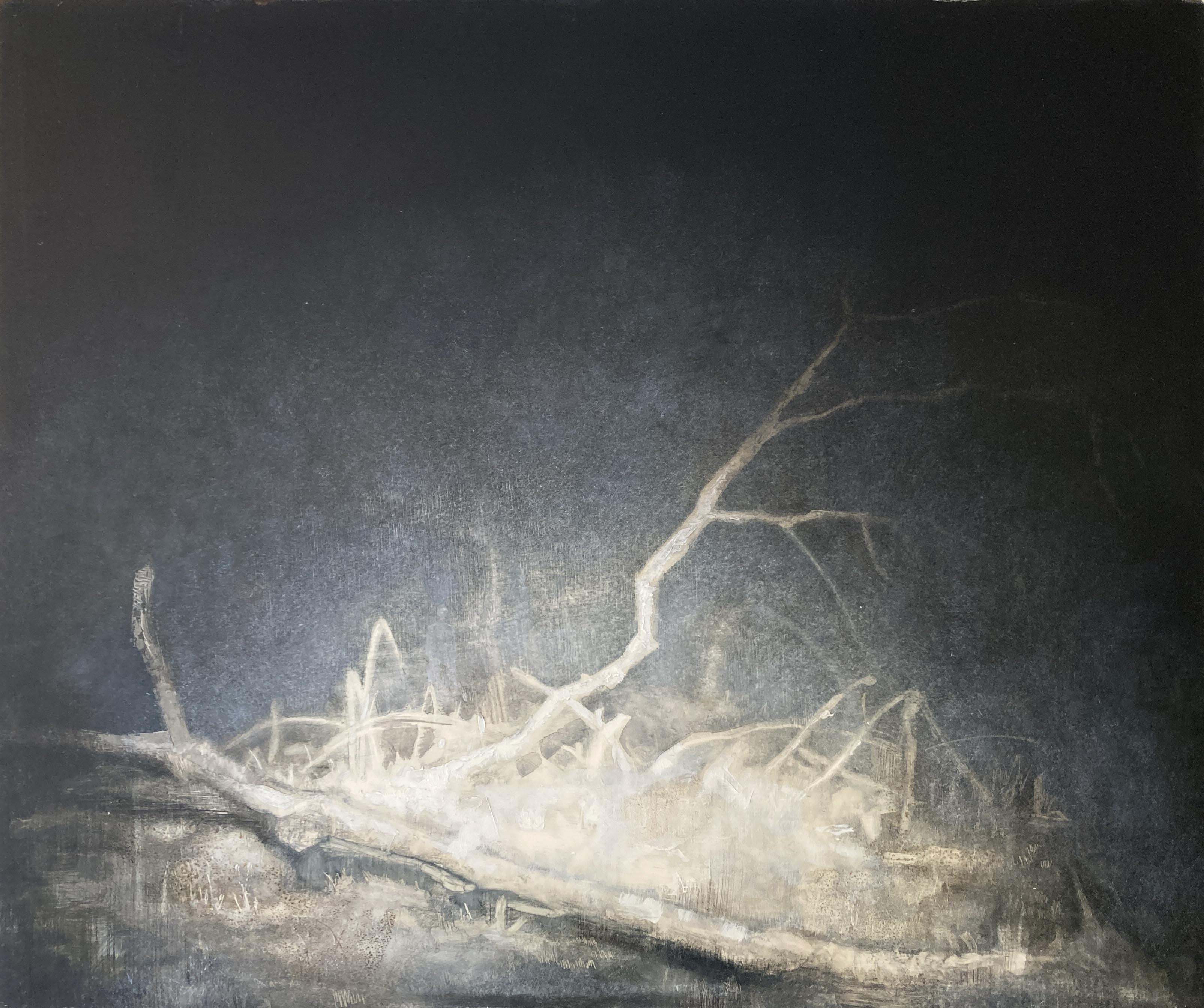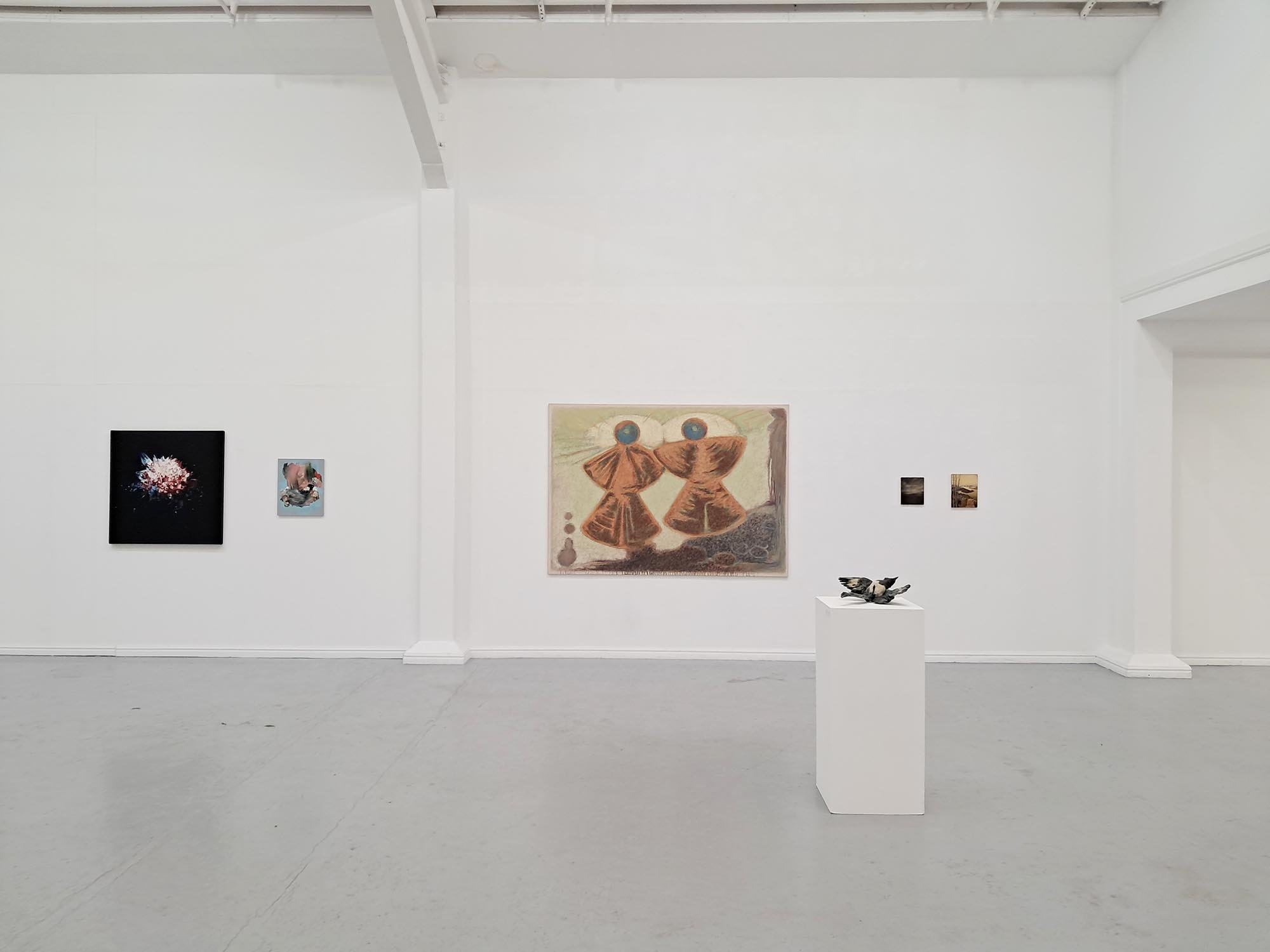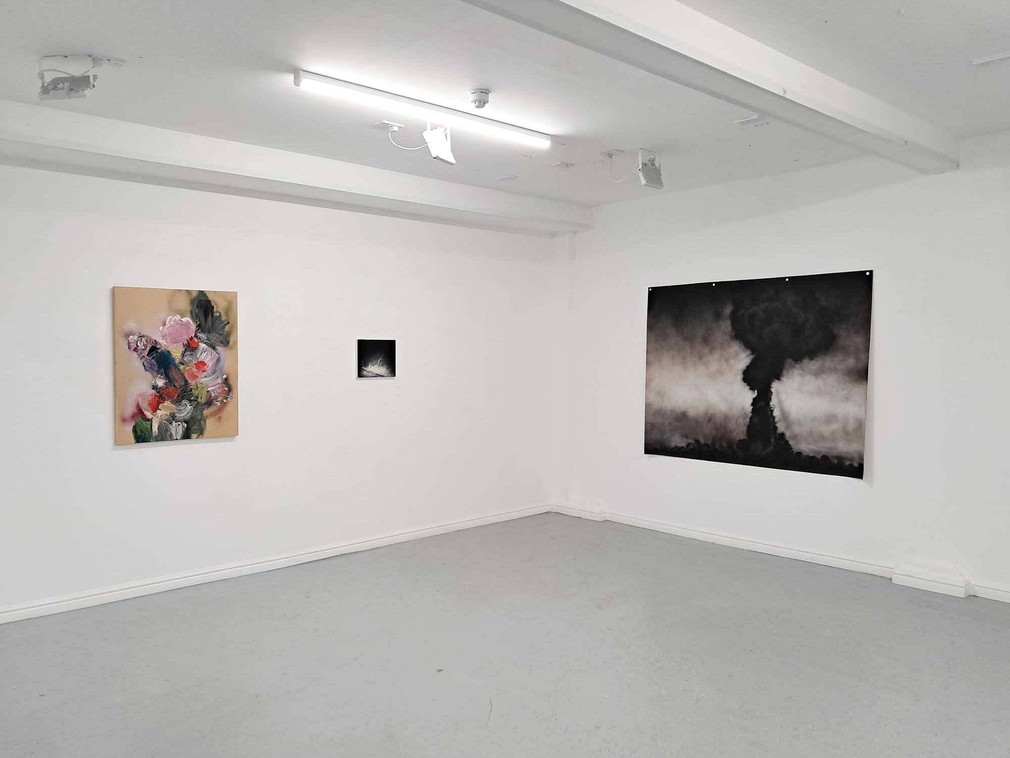 We are pleased to present & Still Different Worlds. A group exhibition featuring seven artists working in the UK today. “I learned that just beneath the surface there's another world, and still different worlds as you dig deeper…there is goodness…but another force, a wild pain and decay, also accompanies everything.” David Lynch Something is pressing up from beneath. The surfaces hold back histories and myths, they do not feel like fixed boundaries but rather, thresholds. The artworks share a preoccupation with forces that exceed our control; erosion, detonation, evaporation, spectral return, decomposition, ecological fragility or blinding light. Considering painting as an object or monument, the mark making becomes almost stubborn, confidently holding its ground at the eye of the storm. For Martyn Cross, the canvas is not a passive ground but something to wrestle with. His small works are cradled, held close; while others are rubbed down with rags, scuffed, even kicked about the studio. This physical push and pull becomes a kind of workout, a way of forcing the paintings to absorb energy, friction and care in equalmeasure. Reoccurring motifs emerge throughout his work: billowing clouds, tumbling waterfalls, oversized fingers point out at us, while bright pastel suns complete an immersive world. Michael Gurhy’s sculptures hover between the intimate and the surreal, where fairy tale meets the feral. For Michael, birds have long been messengers, bearers of mythology, omens and symbols of metamorphosis. 3D printing is often tied to futurism, innovation, and repair, it can reproduce broken parts and create prototypes. But in Gurhy’s work, the printer does not heal or bring back life. Instead, it reproduces death. The birds become uncanny doubles - both faithful reproductions and distorted, ghostly forms. They remain untouchable, poised between nature and artifice. Donna McLean is drawn to uneasy imagery imbued with an eerie beauty that simultaneously comforts and disturbs. A painter of atmosphere and light, she conjures up a strange hushed world, a cinematic memory recalled in a dream. Each formal component that goes into making a painting works like a scaffold on which to drape the mood. The otherworldliness of Paula MacArthur’s glassy, geometric forms spark infinite imaginings on love and loss. In oil paint she finds an equivalent magic and uses luminous colour to create intricate landscapes and new, unreachable worlds. Just like precious stones, the radiance and discomfort in MacArthur’s paintings demands constant re-adjustment. Up close, the marks reveal a loose intensity; at a distance, the beauty of the image reasserts itself. During Miranda Boulton’s explosive process, paint is built up and scraped back, the canvas is turned more than once to destabilise the composition. Different speeds of marks are apparent, built up into thick impasto that takes months to dry. Boulton works directly onto the canvas recalling memories of a specific historical floral painting. Building from the instability of memory, as opposed to directly referencing the historical work, her desire to respond to the original memory is eventually abandoned. Kirsty Harris’s practice centres around the violent, man-made events that scar the landscape: the detonation of the atomic bomb. She returns again and again to that decisive moment, a split second of destructive force, and contemplates it over months of making. All her work sits inside this tension: the awe, the absurdity, the abhorrent nature of human ambition. Working on many paintings at once, Sam Douglas builds up and sands back layers of paint and thick varnish in cycles that echo the geological processes of sedimentation and erosion. Beneath, these paintings retain the strata of previous images that emerge like archaeological remnants. His small paintings remain murky and reflective and there is a melancholic quality to his landscapes which, following certain romantic motifs, often depict twilight. The artworks in & Still Different Worlds resist resolution and persist as afterimages, burned onto the retina. & Still Different Worlds is kindly supported by Contemporary British Painting. Thames-Side Studios Gallery Thames-Side Studios Harrington Way, Warspite Road Royal Borough of Greenwich London SE18 5NR Open Thursday-Sunday, 12-5pm, during exhibitions. For general Thames-Side Studios Gallery enquiries please email [email protected] Disabled access. Free, limited parking is available on site. How to get here: Bicycle: Thames River cycle path (16 mins cycle from Greenwich). Bus: 161 / 177 / 180 / 472 to Warspite Road bus stop. DLR: Woolwich Arsenal (1 minute walk to Plumstead Road and take Route Bus 177 towards Peckham Bus Station or 472 towards North Greenwich Station). Road: A2 corridor, first roundabout east of Thames Barrier onto Warspite Road. Train: From Cannon Street or London Bridge to Woolwich Dockyard (8 minute walk) or Charlton (12 minute walk). Tube: North Greenwich (Take the Route Bus 472 towards Thamesmead Town Centre). Crossrail: Elizabeth Line to Woolwich (take Route Bus 177 towards Peckham Bus Station or 472 towards North Greenwich Station).