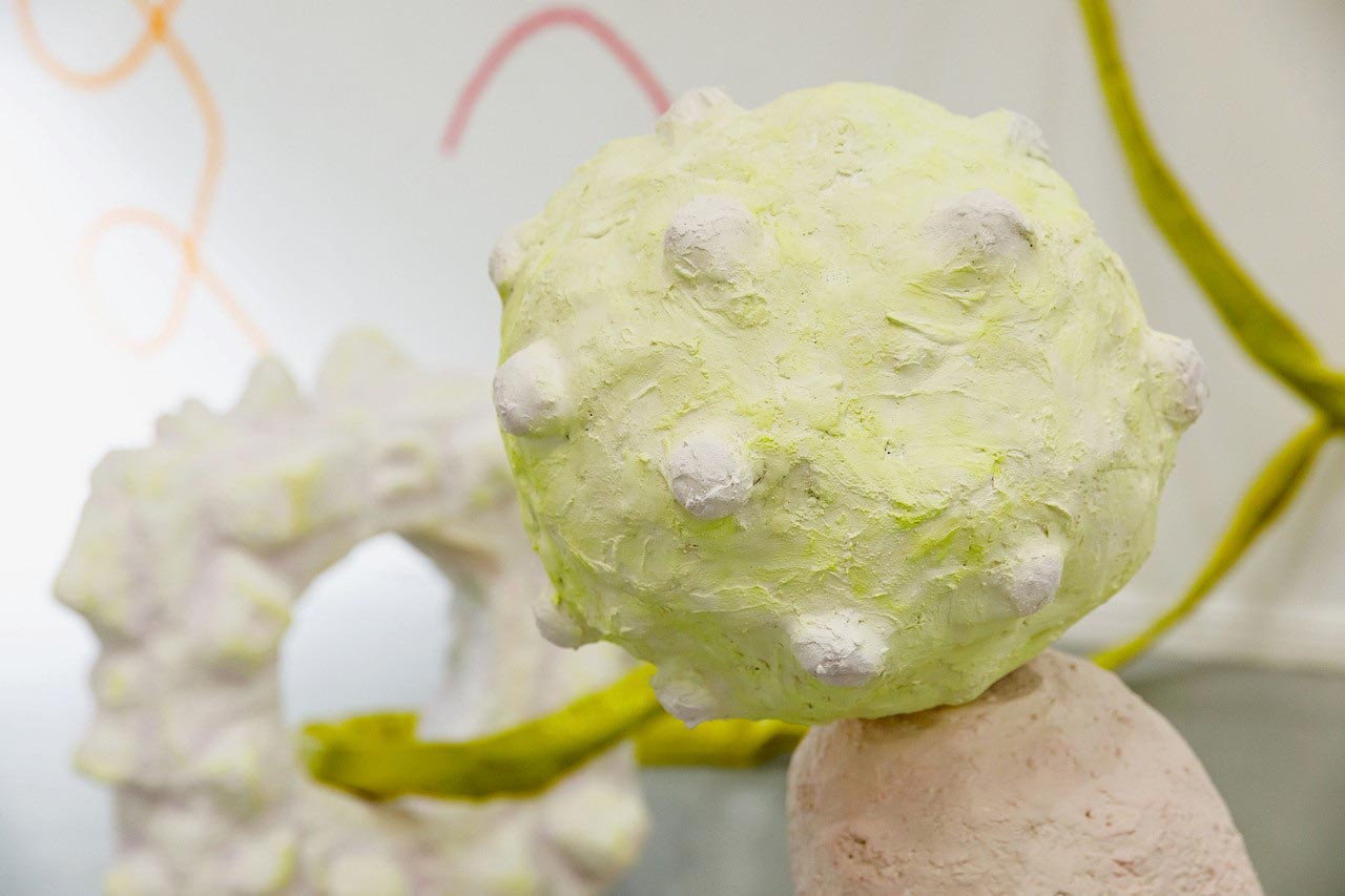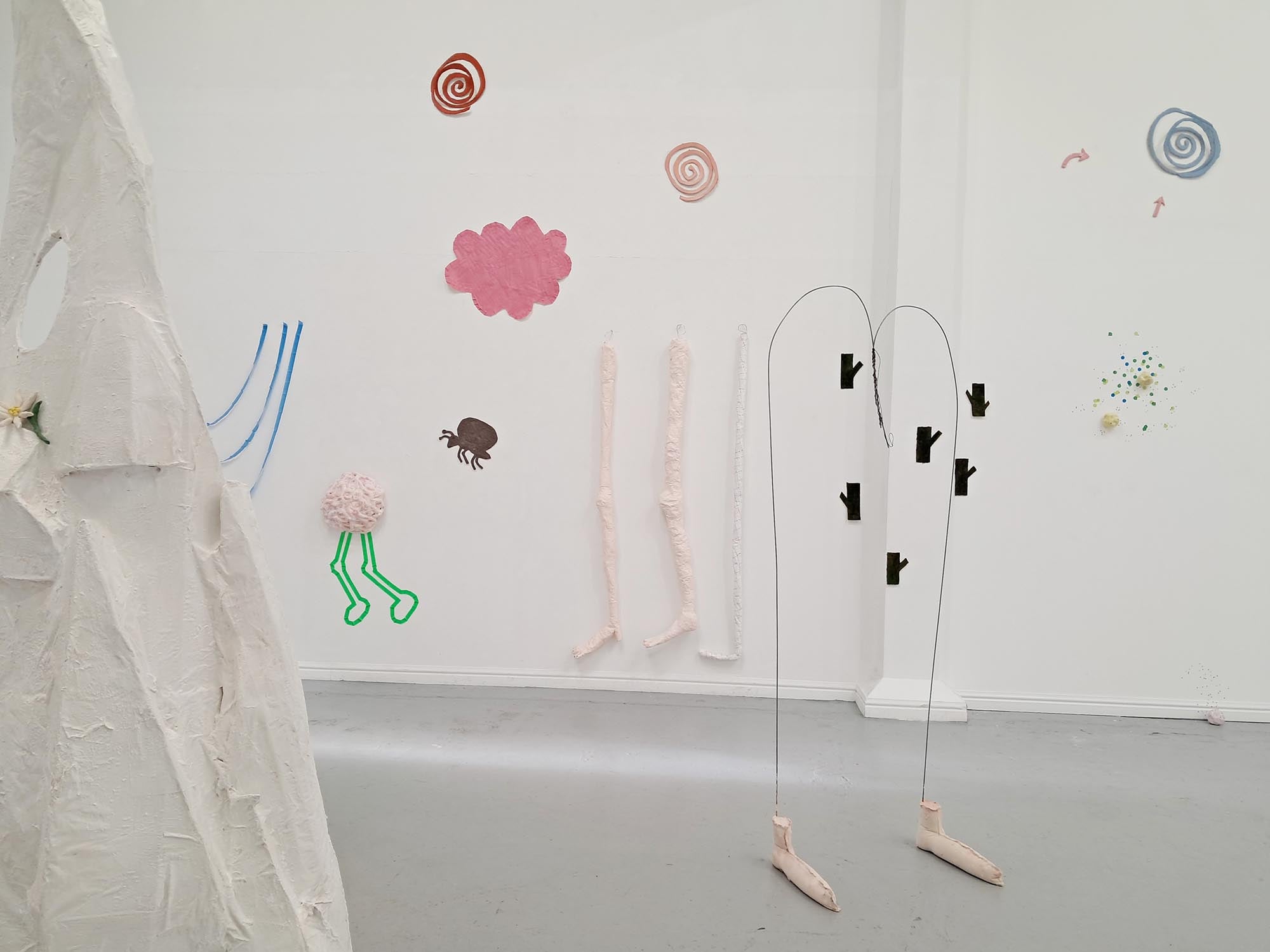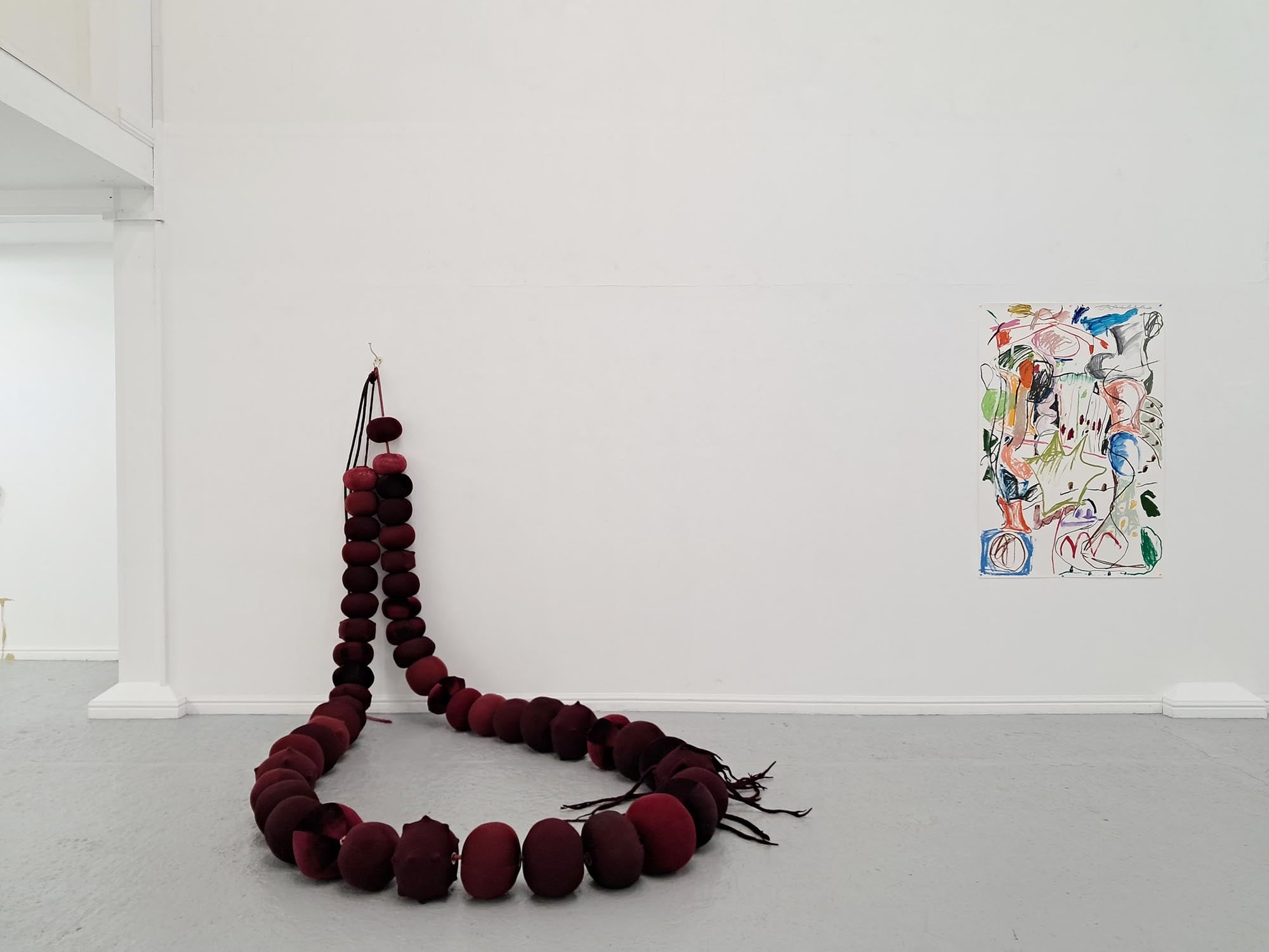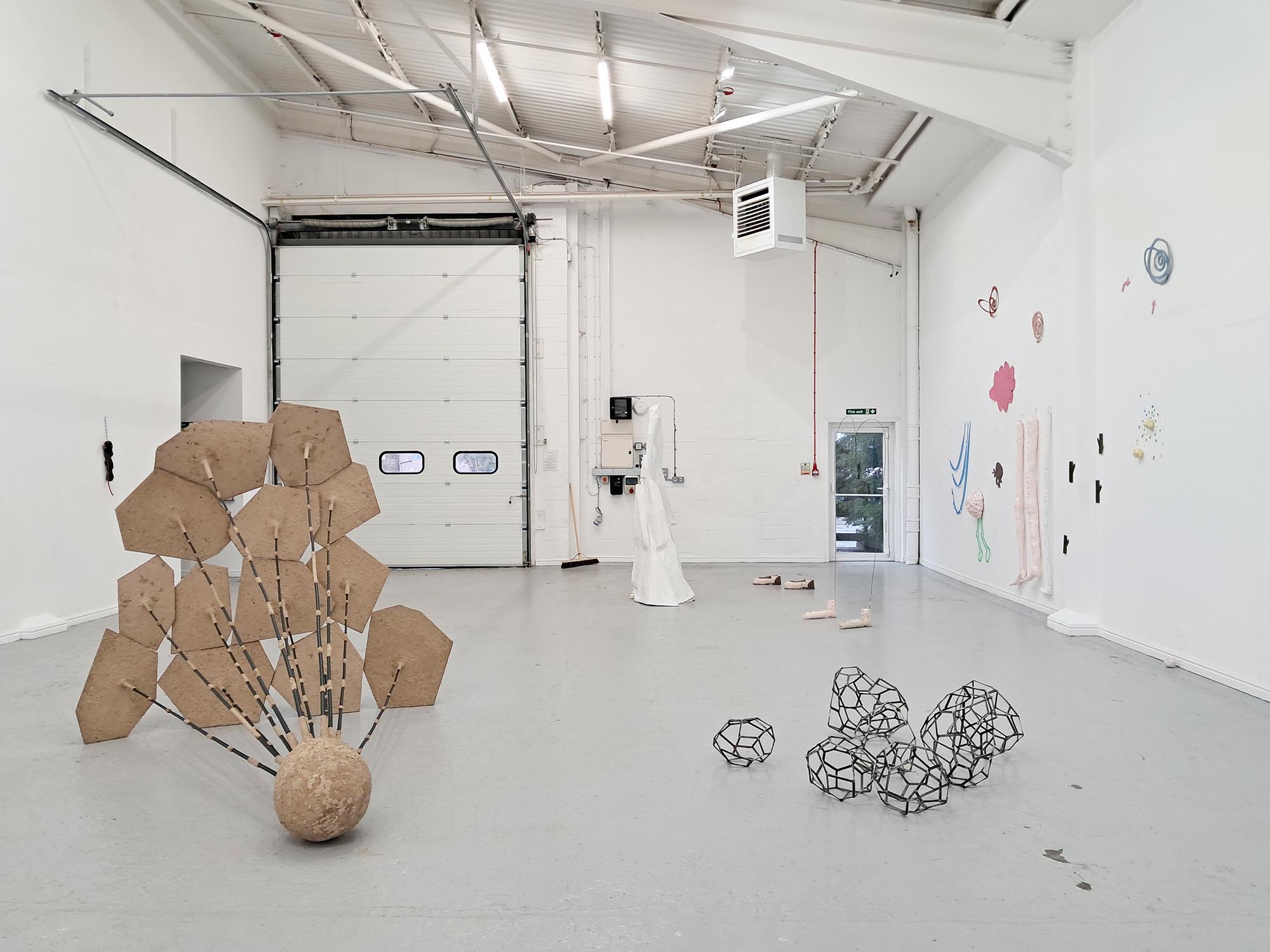 Between the Floor and the Wall presents the work of seven artists whose work oscillates between the flat and the fat; the horizontal and the vertical. Their diverse artistic outputs share an excitement about playing with spaces and meaning throughout the zone between the floor and the wall, bringing energy and humour to this project at Thames-Side Studios Gallery. The exhibition includes works made with diverse, experimental and sustainable approaches to textiles, sculpture, ceramics and found materials. About the artists: Eleanor Bedlow works in between the disciplines of drawing, painting and sculpture, pairing tactile and organic forms in works that feel as though they are exploring, leaning, feeling, listening. @eleanorbedlow Johanna Bolton works across sculpture, installation and performance, engaging with complexity and the unknowable, and imprints of human presence in everyday objects and material encounters. @johanna.bolton Jenny Camp practices sculptural auto-cannibalism, physically making things out of desire and necessity but then frequently chopping up, adding to, or breaking down older pieces, mining them as material for new work. @jennyscamp_ Pattern, repetition and rhythm are central to Janet Currier’s installation with sculpture, drawing and painting, where scraps of well-worn garments worked into her sculptures, and invented wallpaper denote the domestic space; vulnerability, care and resilience. @janetdcurrier Sandra Lane works feelings of ambivalence, optimism and failure into multiple forms made from malleable materials, exploring memories, how to be a female and the absurd. In new edible and wearable works she enjoys pushing against the limits of sculpture, as much as the materials themselves. @artysandralane Jonathan McCree works with drawing, painting, sculpture, film and performance, as a record of movement and emotion through space. His playful, experimental practice pushes the boundaries of architecture, exploring spatial ideas and qualities. @jonathanmccree Jane Millar works with ceramics, wall painting and installation. The narrative emerges from the chaotic zone between our perceived inside and outside; a place of becoming and repurposing, of remnants of objects, mythologies, and a future speculation of a cosmos. @jmillarstudio Thames-Side Studios Gallery Thames-Side Studios Harrington Way, Warspite Road Royal Borough of Greenwich London SE18 5NR For general Thames-Side Studios Gallery enquiries please email [email protected] Disabled access. Free, limited parking is available on site. How to get here: Bicycle: Thames River cycle path (16 mins cycle from Greenwich). Bus: 161 / 177 / 180 / 472 to Warspite Road bus stop. DLR: Woolwich Arsenal (1 minute walk to Plumstead Road and take Route Bus 177 towards Peckham Bus Station or 472 towards North Greenwich Station). Road: A2 corridor, first roundabout east of Thames Barrier onto Warspite Road. Train: From Cannon Street or London Bridge to Woolwich Dockyard (8 minute walk) or Charlton (12 minute walk). Tube: North Greenwich (Take the Route Bus 472 towards Thamesmead Town Centre). Crossrail: Elizabeth Line to Woolwich (take Route Bus 177 towards Peckham Bus Station or 472 towards North Greenwich Station).