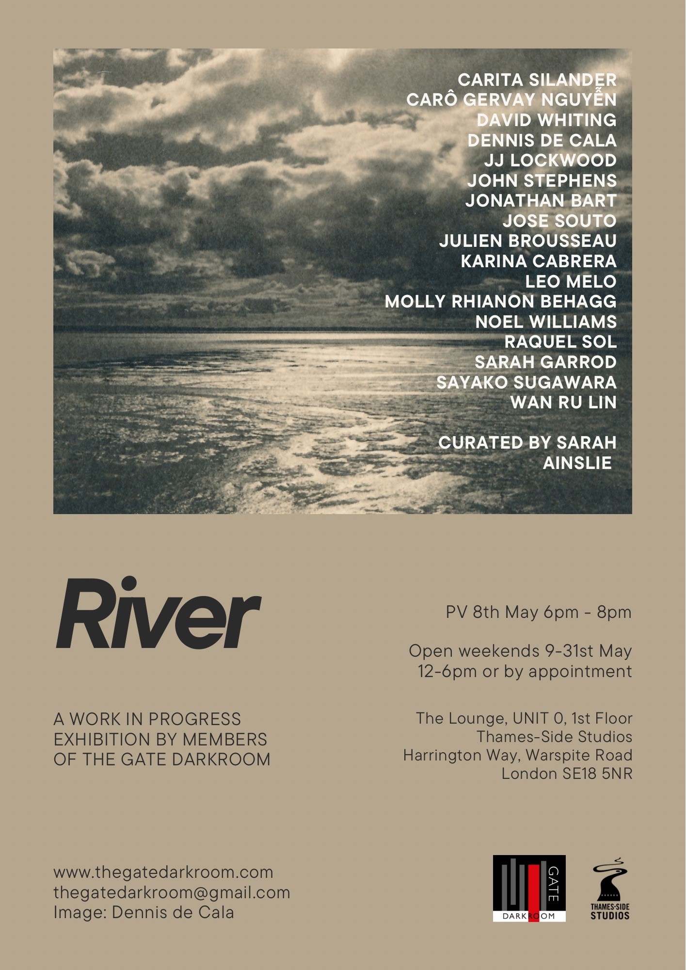 River is an exhibition of analogue photographic works by members of The Gate Darkroom, a community darkroom situated next to the Thames in Greenwich. Curated by Sarah Ainslie, the exhibition brings together a diverse range of responses by members to the theme of ‘River’ explored through analogue photography. Works are inspired by the river theme both as a presence in the landscape and as a concept, drawing on its transitory nature and the narratives it carries: loss and transition, beginnings and endings, environmental change and generational memory. The exhibition is a moment of collective reflection, a space for members to share work in progress before developing it further towards a larger group show. Image: Dennis de Cala Thames-Side Studios Lounge is located on the second floor of Unit 0 and open to all studio holders and by appointment. The Lounge, Unit 0 Thames-Side Studios Harrington Way, Warspite Road Royal Borough of Greenwich London SE18 5NR Free, limited parking is available on site. How to get here: Bicycle: Thames River cycle path (16 mins cycle from Greenwich). Bus: 161 / 177 / 180 / 472 to Warspite Road bus stop. DLR: Woolwich Arsenal (1 minute walk to Plumstead Road and take Route Bus 177 towards Peckham Bus Station or 472 towards North Greenwich Station). Road: A2 corridor, first roundabout east of Thames Barrier onto Warspite Road. Train: From Cannon Street or London Bridge to Woolwich Dockyard (8 minute walk) or Charlton (12 minute walk). Tube: North Greenwich (Take the Route Bus 472 towards Thamesmead Town Centre). Crossrail: Elizabeth Line to Woolwich (take Route Bus 177 towards Peckham Bus Station or 472 towards North Greenwich Station).