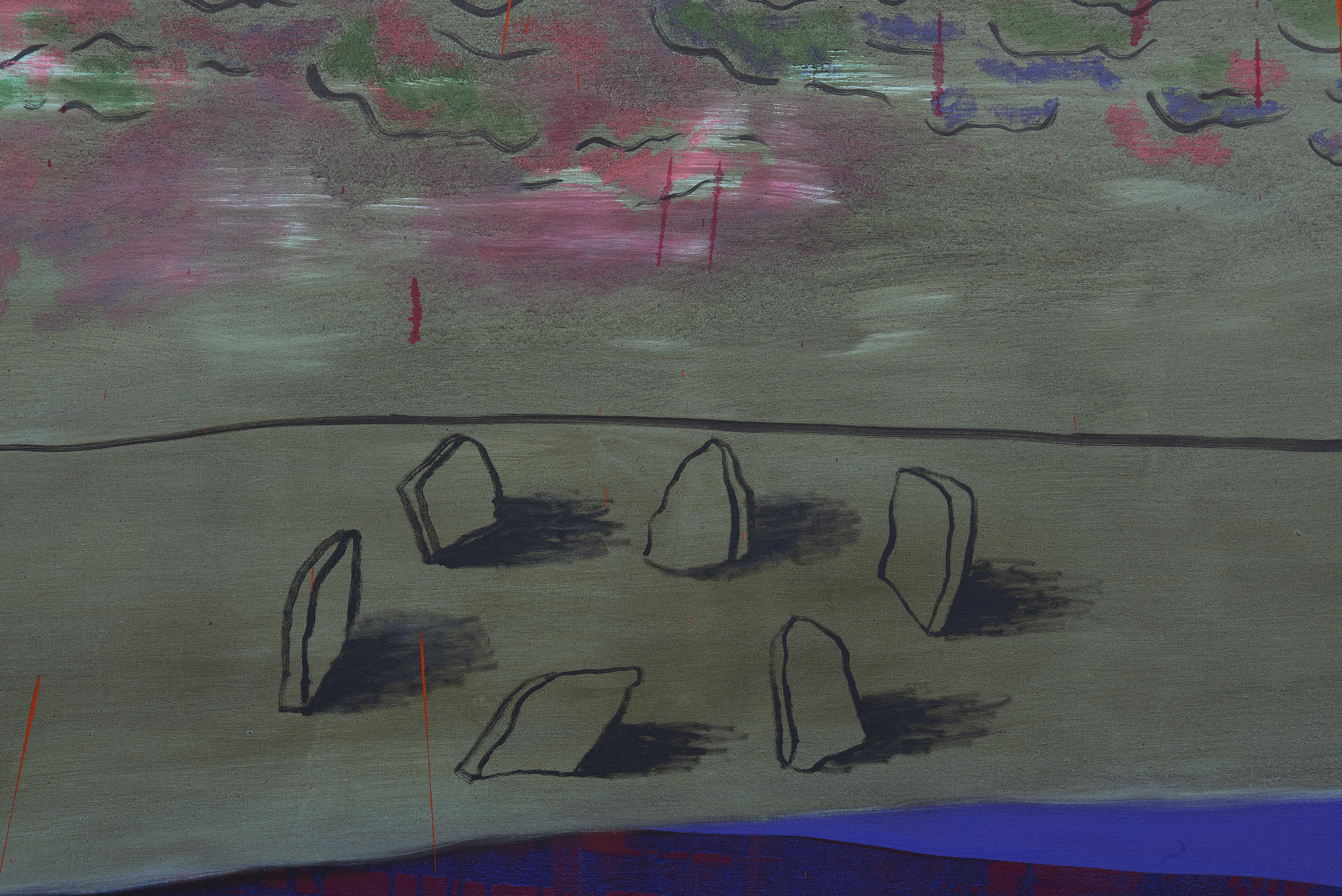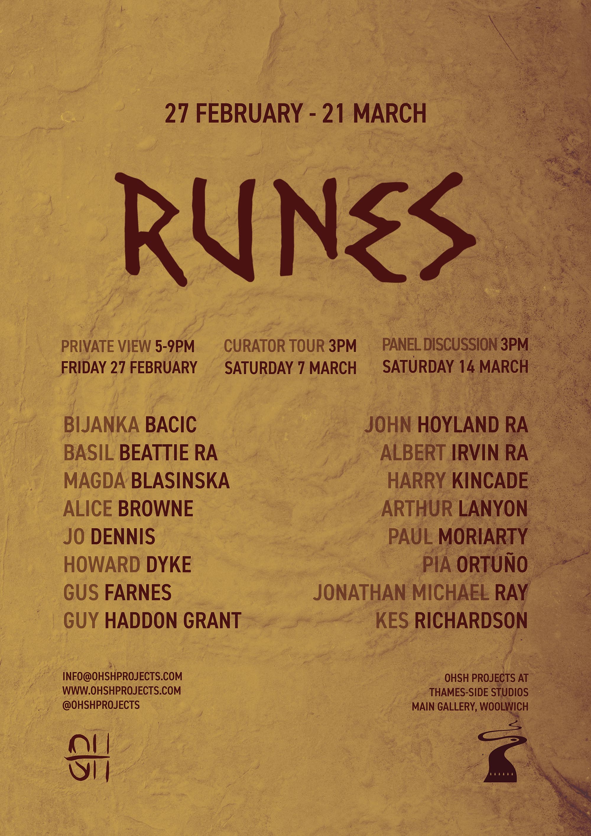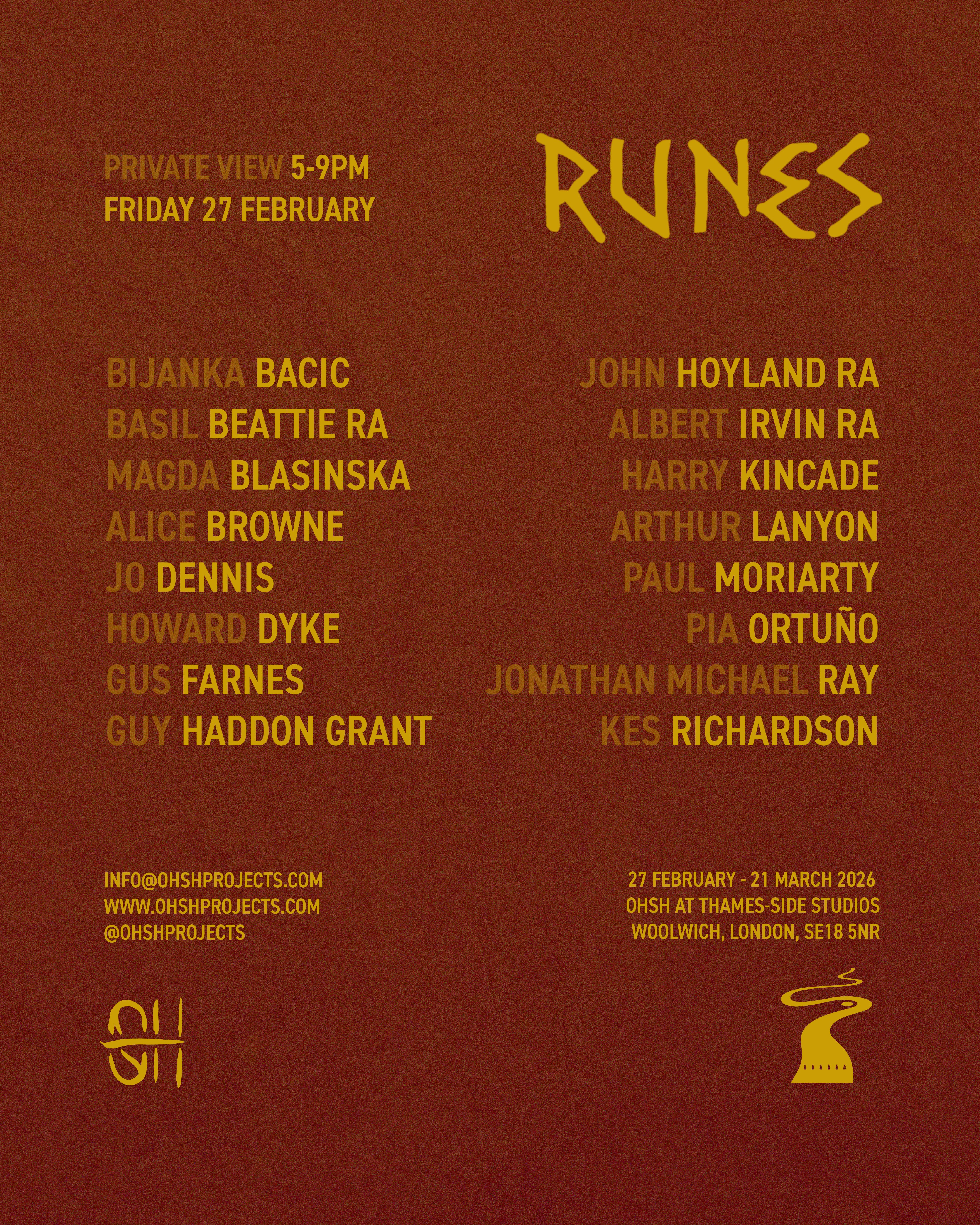 Curated by OHSH Projects, RUNES explores the emergence of human markmaking through abstract art, it considers visual language as an unbroken thread linking contemporary artists to ancient traditions of creating symbols. www.ohshprojects.com/runes About OHSH Projects OHSH Projects is a nomadic project space, conceived in 2021 by Henry Hussey and Sophia Olver from the desire to create tactile conversations between artists and spaces. OHSH Projects is a collage of ideas explored through the artists they work with and the dialogues that emerge between their processes. Their curatorial approach draws on ancient mythology, history and symbolism to decode the paradoxes and inner struggles of contemporary life. Through their nomadic set-up, they take on various forms transforming diverse locations, from more traditional white cube gallery spaces to unconventional, raw and historic environments, with each iteration inviting participation and reflection. Thames-Side Studios Gallery Thames-Side Studios Harrington Way, Warspite Road Royal Borough of Greenwich London SE18 5NR Open Thursday-Sunday, 12-5pm. For general Thames-Side Studios Gallery enquiries please email [email protected] Disabled access. Free, limited parking is available on site. How to get here: Bicycle: Thames River cycle path (16 mins cycle from Greenwich). Bus: 161 / 177 / 180 / 472 to Warspite Road bus stop. DLR: Woolwich Arsenal (1 minute walk to Plumstead Road and take Route Bus 177 towards Peckham Bus Station or 472 towards North Greenwich Station). Road: A2 corridor, first roundabout east of Thames Barrier onto Warspite Road. Train: From Cannon Street or London Bridge to Woolwich Dockyard (8 minute walk) or Charlton (12 minute walk). Tube: North Greenwich (Take the Route Bus 472 towards Thamesmead Town Centre). Crossrail: Elizabeth Line to Woolwich (take Route Bus 177 towards Peckham Bus Station or 472 towards North Greenwich Station).