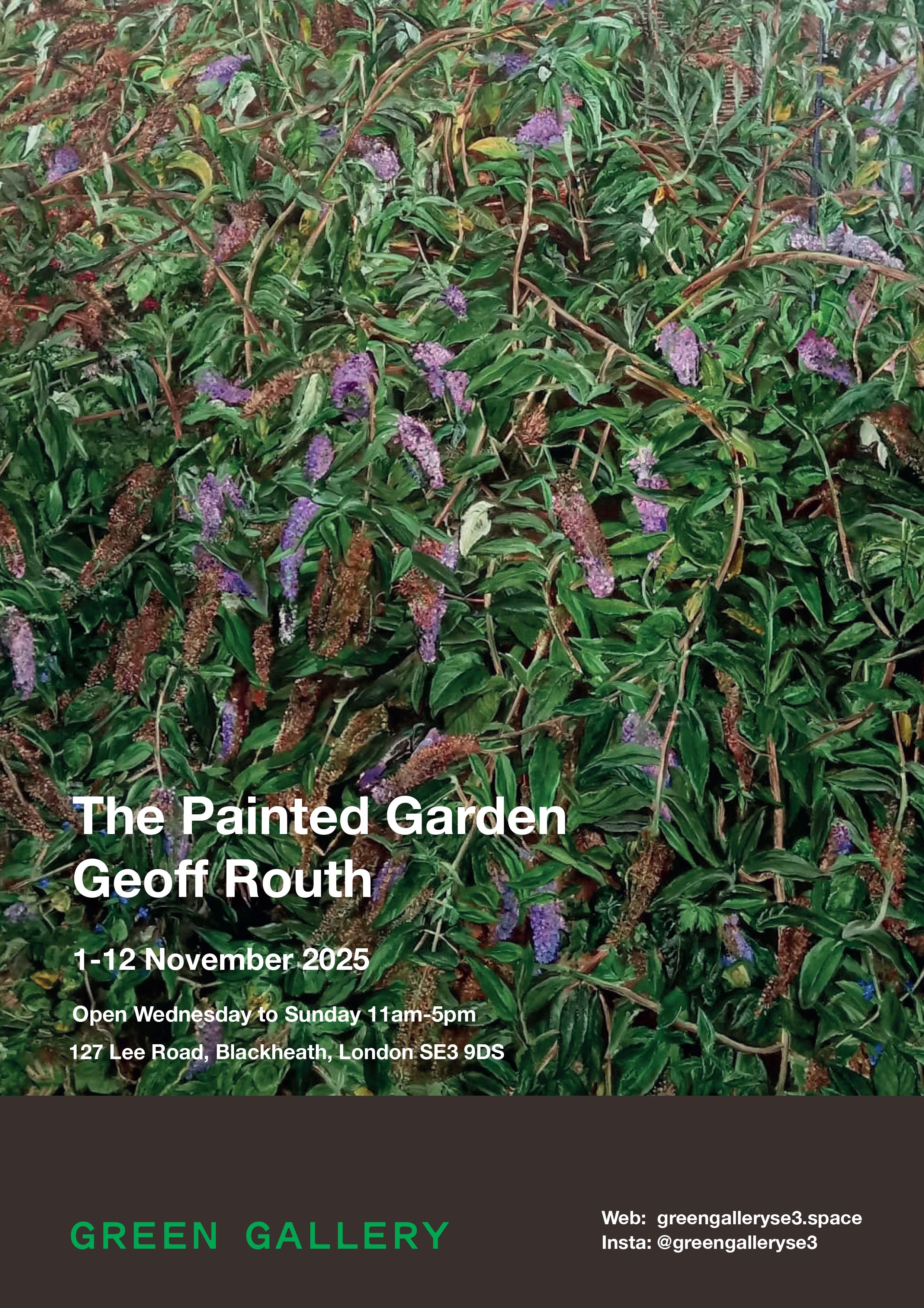 Geoff Rouff’s (7-223) latest solo show of garden paintings opens at Green Gallery, 127 Lee Road, Blackheath, SE3 9AT from 1 November. Open Wednesday to Sunday 11am-5pm. Follow Geoff Routh @geoff_routh and Green Gallery on Instagram @greengalleryse3 www.greengallery.space