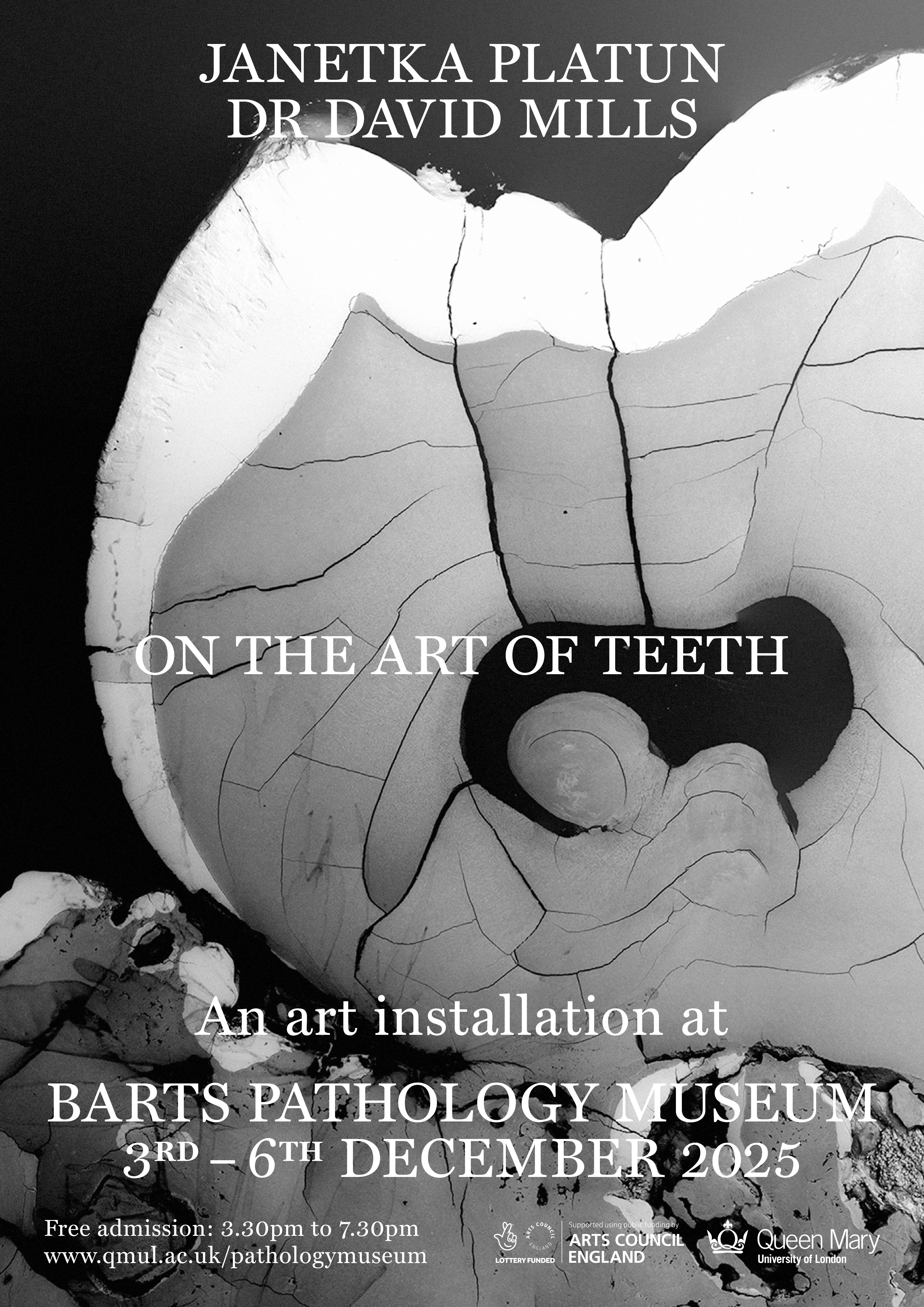 On The Art Of Teeth, by Janetka Platun (0-205) and Dr David Mills provides a rare opportunity to visit Barts Pathology Museum, where this site-specific installation responds to the Museum’s own historic collection of tooth specimens dating back to the 19th century.