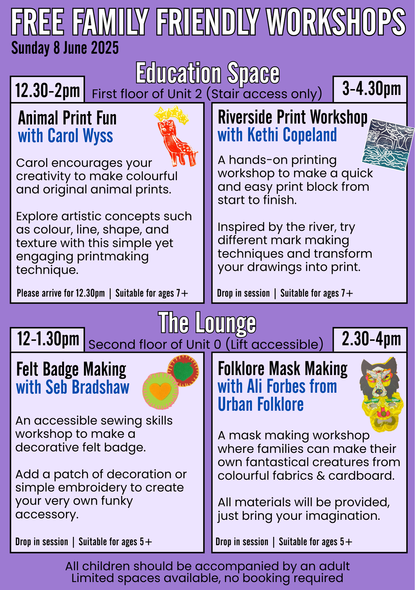 We have a variety of family friendly workshops to look forward to at our Open Studios event. All children should be accompanied by an adult. Limited spaces, no booking required.