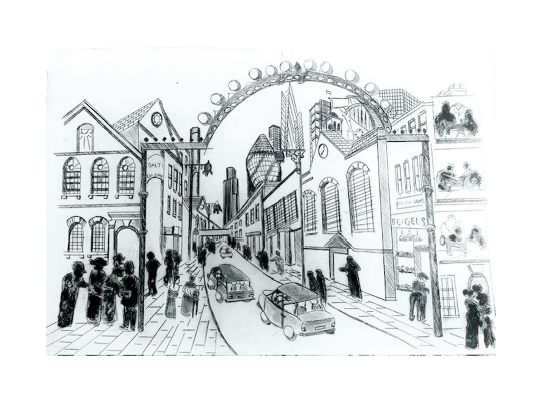 Guided by the question, “If I am only for myself, what am I?” (Hillel, 10 BC), she explored urban landscapes, particularly places of worship and docks—sites of migration and social change. Stewart highlights the immigrant struggle with displacement, cultural shifts, and stereotypes, drawing from her family history and teaching in London’s diverse schools.