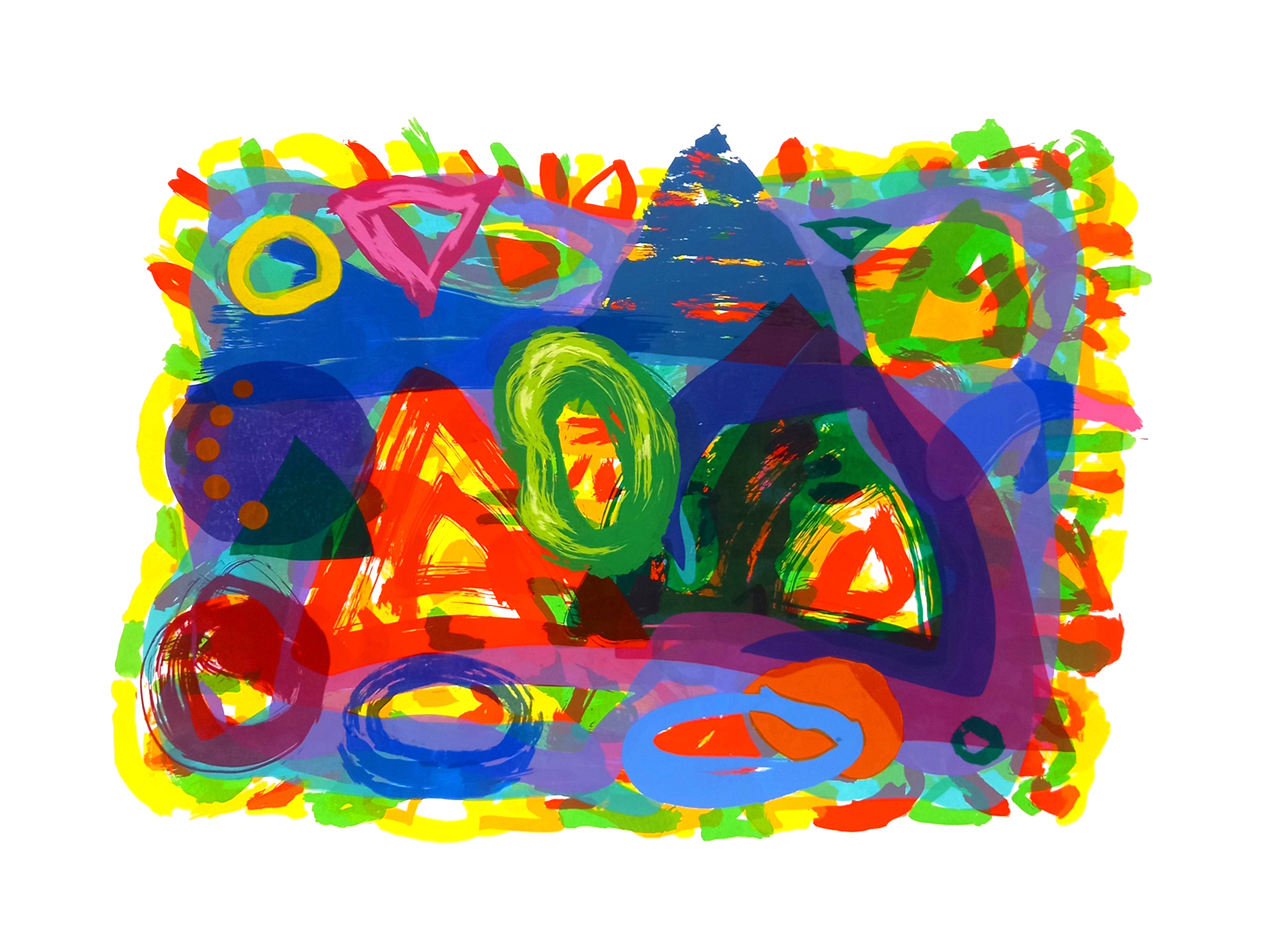 Joan Miro, John Hoyland, Bert Irvin and A. R. Penck, artists I liked at the time, had been influences during this period. I have treated screenprinting as an abstract fine artist would starting with random, chaotic shapes and colours and gradually adding more refined and considered elements to arrive at a final composition. I have created stencils that explore both opaqueness and transparency by adjusting the amount of acrylic medium used. Also, by mixing hard edged shapes with more freeform brushed edges.