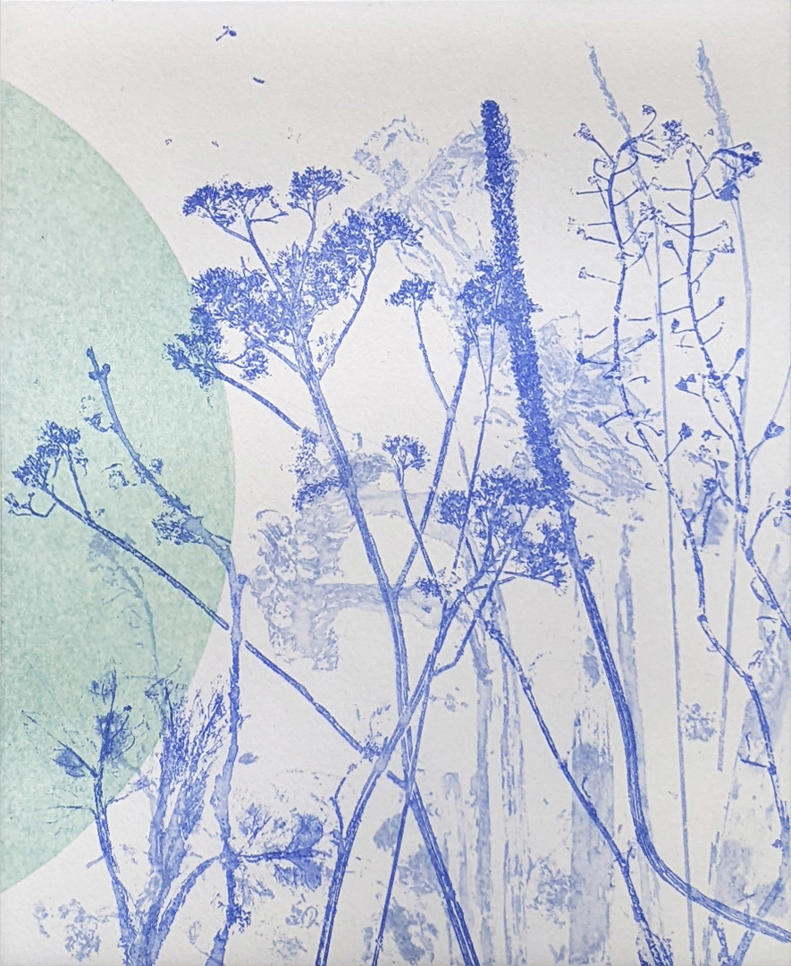 Thames-side Print Studio is proud to present her newest body of work, ‘Improvisations’. Plant matter collected during her daily commute along the Thames Path is deeply etched into large steel plates using acrylic grounds and saline sulphate solution. The plates are printed in small editions, and then form a library of imagery, surface and texture that can be used over and over again. These improvisations are developed directly on the press and result in unique prints in sequence, a composition that is practiced and changed with each performance, akin to music as much as art.