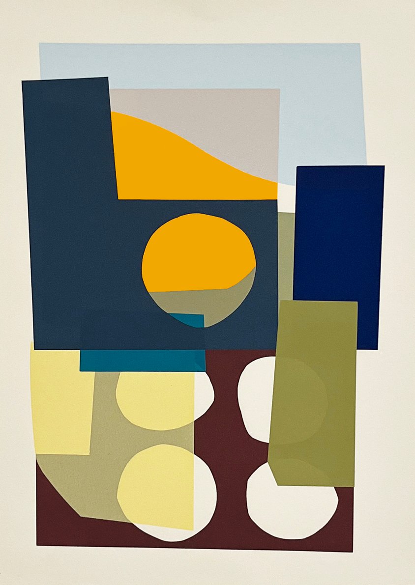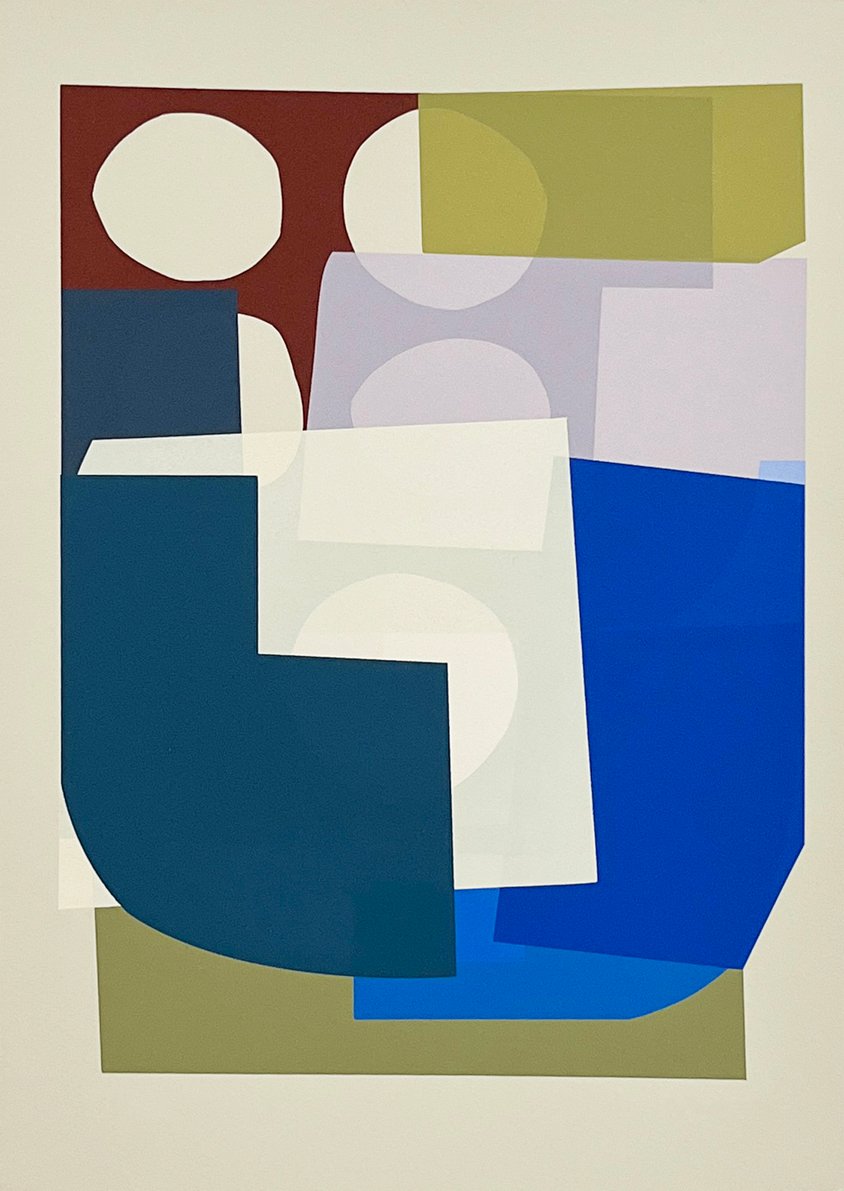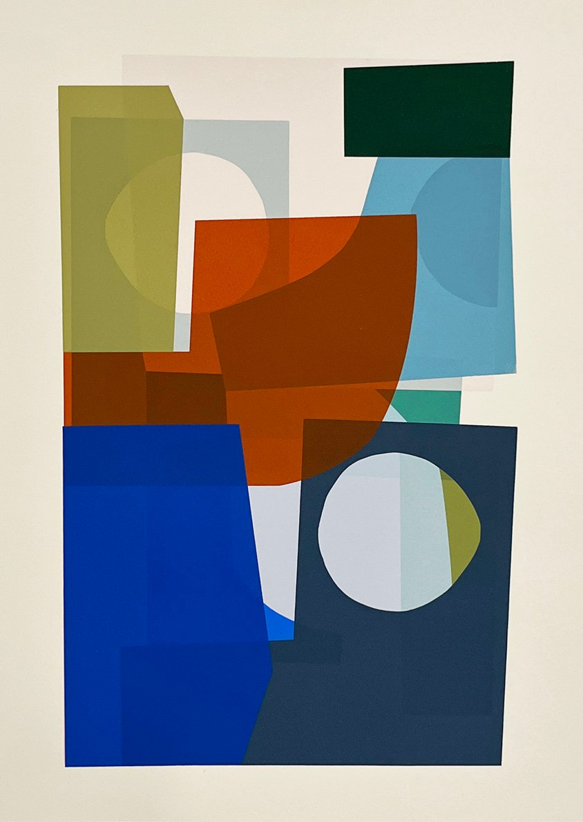 A graduate of Leeds Arts University with a BA in Printed Textiles & Surface Pattern Design (2009), Jonathan spent several formative years developing his practice in Berlin before returning to the UK. His distinctive visual language is defined by layered shapes, intricate patterns, and a rhythmic interplay of colour and form. Abstract compositions form through an organic, process-led technique that embraces experimentation and evolves through the act of screen printing.