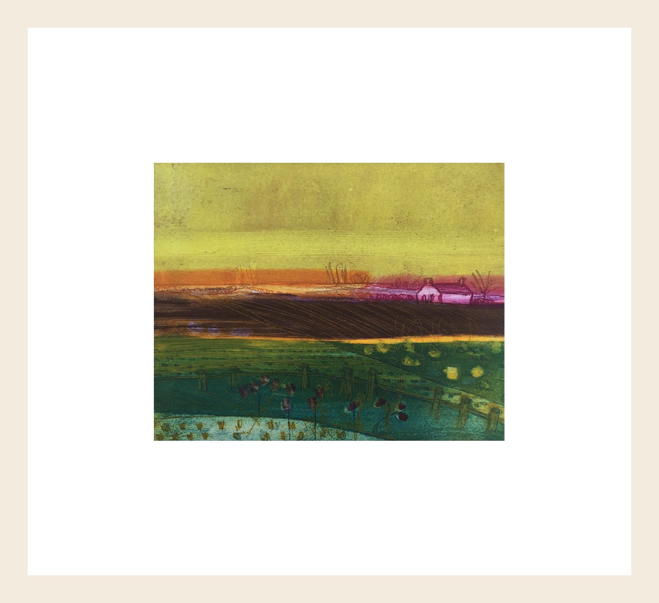 Louise’s prints and paintings are primarily concerned with the landscape. Some are based on childhood memories, reflecting on the countryside and coast of the west of England where she spent her early childhood. However some of the prints are created from small paintings and drawings made on location in sketchbooks.