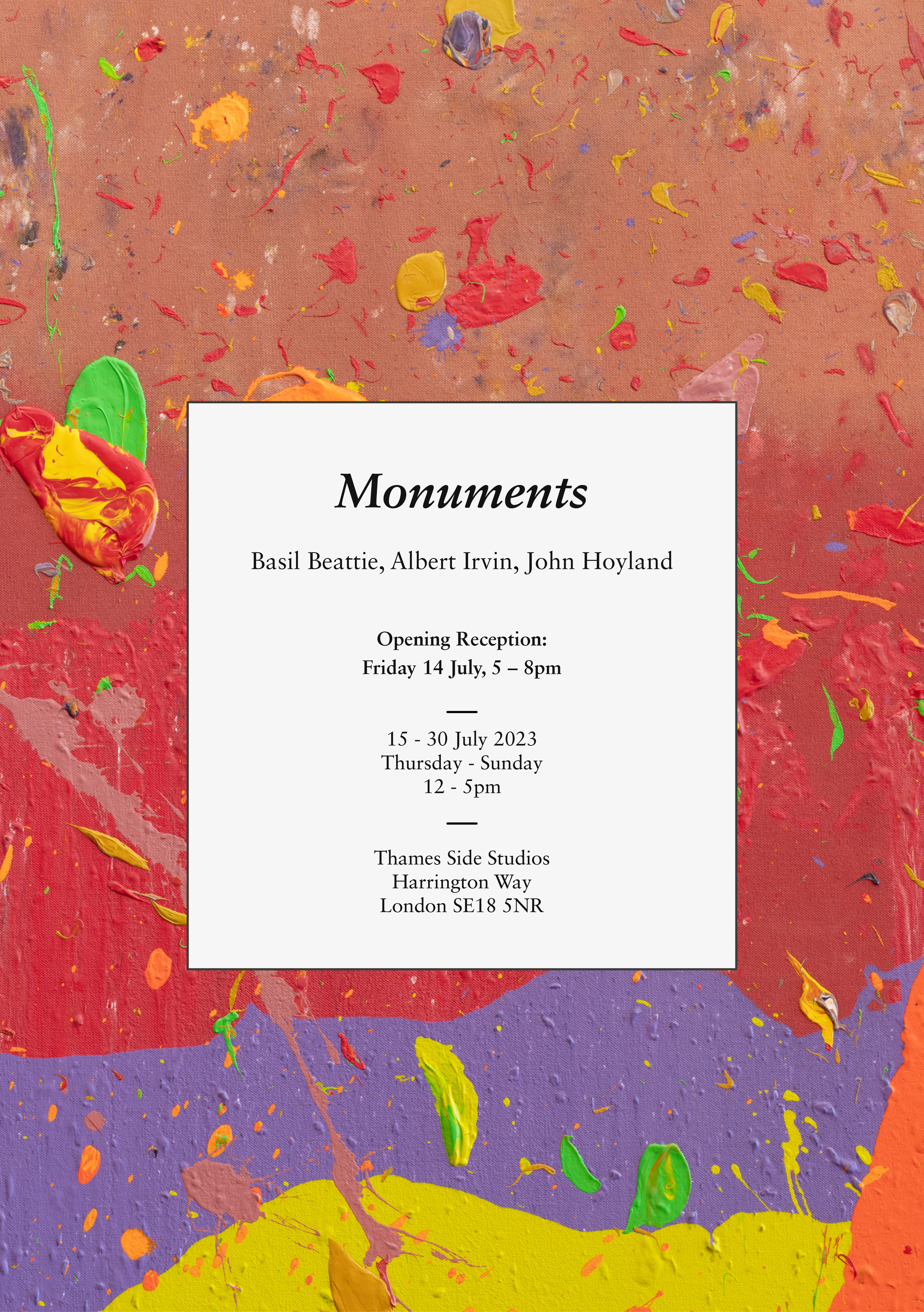 Monuments brings together monumental abstract paintings by three legendary artists and contemporaries, John Hoyland RA, Albert Irvin OBE RA and Basil Beattie RA. Monuments has been selected by Hales Gallery co-founder Paul Hedge and London based painter Paul Moriarty. Both share a deep interest, passion and shared knowledge for these artists from working class backgrounds, who exemplify the best of British abstract painters of this era. Monuments explores breakthrough moments in each artists’ oeuvre over the course of three decades. The show celebrates these key periods of painterly development, in which they explored a desire to make innovative work which envelops the viewer. During their long careers they made, and in the case of Beattie continue to make, paintings on a vast scale in which reference is made to architectural form. Hoyland (b.1934 Sheffield, UK – d.2011 London, UK), Irvin (b. 1922 London, UK – d. 2015 London, UK) and Beattie (b. 1935 Hartlepool, UK) are part of a milieu of British artists whose work continued the legacy of Abstract Expressionism. Inspired by the first American Abstract Expressionism shows in London’s galleries and museums during the 1950s, particularly The New American Painting show at Tate Gallery in 1959, the artists began experimenting with abstract, large-scale paintings of their own. For Hoyland, a key period in his practice came between 1969 and 1970. The artist had previously been making stain paintings, which defined his early work, culminating in a solo presentation at the Whitechapel Gallery in 1967. In 1969, Hoyland’s paint application became more visceral, replacing a former geometry. By 1970, the slabs of paint explode and fizz with a new energy. There is something brutal and elemental about them, not dissimilar in feel to Denys Lasdun’s National Theatre which was under construction at the time. For Irvin, the mid 1970s through to the early 1980s were particularly productive years. After his move to a studio in Stepney Green, Irvin’s paintings became more structural and raw. In 1978 and again in the early 1980s Irvin spent considerable periods of time exploring Britain’s historic cathedrals, particularly Durham. In the artist’s 1998 monograph ‘Life to Painting,’ the writer Paul Moorhouse describes Irvin’s work in these terms, coining the phrase ‘The architecture of imagination’. In the 1980s, Beattie began to develop a lexicon of painted signs and symbols making reference to tunnels, ladders, roadways, steps and staircases. This universal vocabulary, when enmeshed with the artists gestural sweeps and strokes of the brush, became a language instantly recognizable as Beattie’s own. By 1989, Beattie had made significant breakthroughs of his own, culminating in his 1993 exhibition at MAAK gallery in North London. These artists might not have claimed to be making monuments or even statements of an architectural nature. It is however clear that they have considered the heft and form of the built environment in order to achieve a distinct weightiness with paint and canvas. Thames-Side Studios Gallery Thames-Side Studios Harrington Way, Warspite Road Royal Borough of Greenwich London SE18 5NR. Thames-Side Studios Gallery open Thursday-Sunday 12-5pm during exhibitions and by appointment. For general Thames-Side Studios Gallery enquiries please email [email protected]