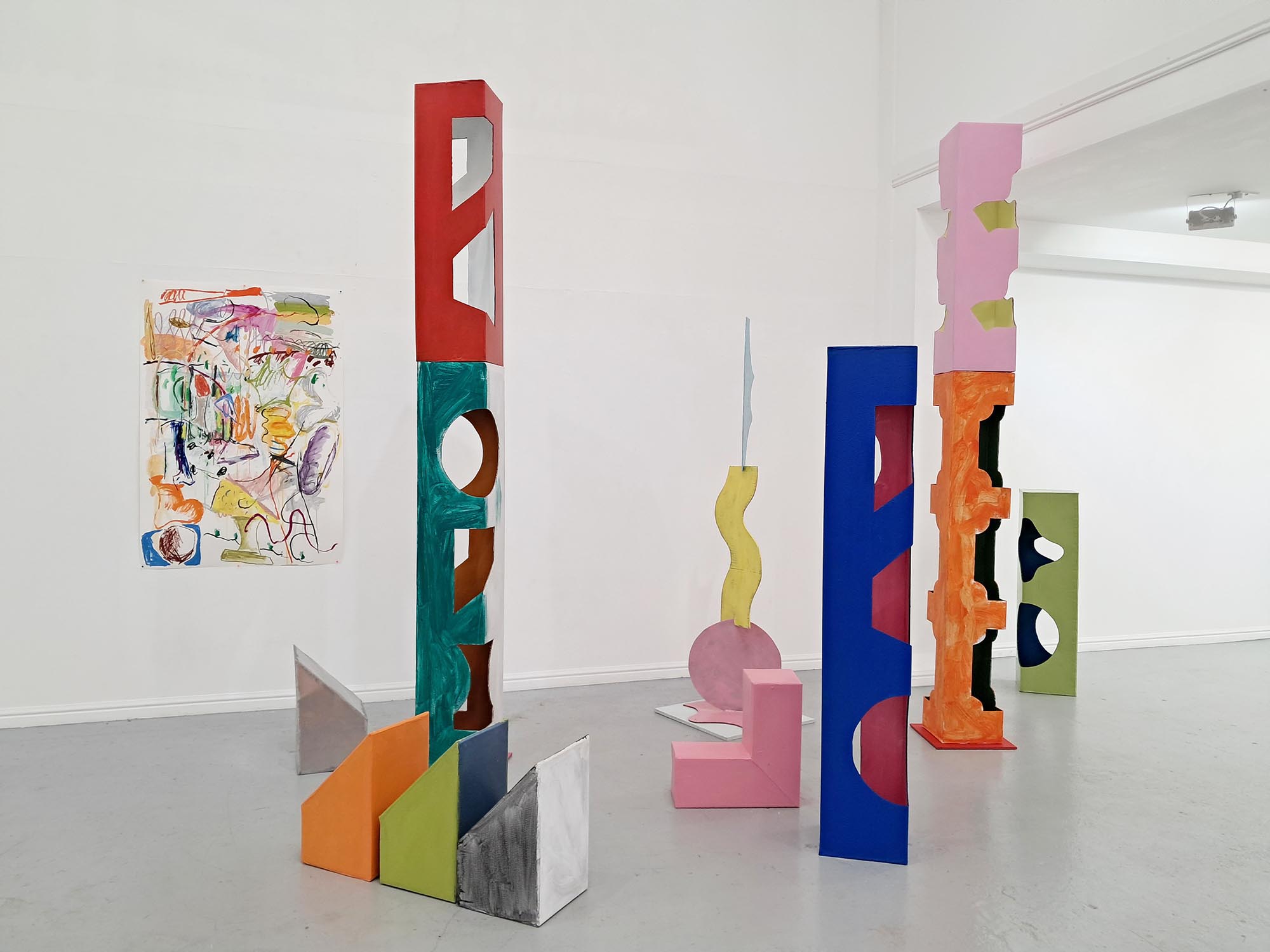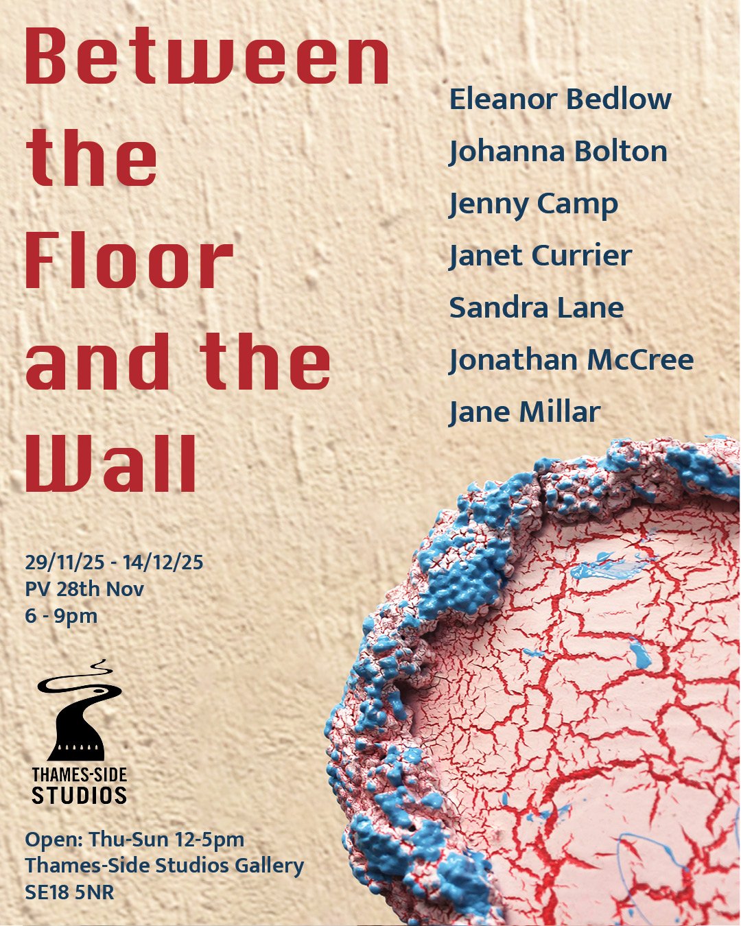 Between the Floor and the Wall presents the work of seven artists whose work oscillates between the flat and the fat; the horizontal and the vertical. Their diverse artistic outputs share an excitement about playing with spaces and meaning throughout the zone between the floor and the wall, bringing energy and humour to this project at Thames-Side Studios Gallery. The exhibition includes works made with diverse, experimental and sustainable approaches to textiles, sculpture, ceramics and found materials. About the artists: Eleanor Bedlow works in between the disciplines of drawing, painting and sculpture, pairing tactile and organic forms in works that feel as though they are exploring, leaning, feeling, listening. @eleanorbedlow Johanna Bolton works across sculpture, installation and performance, engaging with complexity and the unknowable, and imprints of human presence in everyday objects and material encounters. @johanna.bolton Jenny Camp practices sculptural auto-cannibalism, physically making things out of desire and necessity but then frequently chopping up, adding to, or breaking down older pieces, mining them as material for new work. @jennyscamp_ Pattern, repetition and rhythm are central to Janet Currier’s installation with sculpture, drawing and painting, where scraps of well-worn garments worked into her sculptures, and invented wallpaper denote the domestic space; vulnerability, care and resilience. @janetdcurrier Sandra Lane works feelings of ambivalence, optimism and failure into multiple forms made from malleable materials, exploring memories, how to be a female and the absurd. In new edible and wearable works she enjoys pushing against the limits of sculpture, as much as the materials themselves. @artysandralane Jonathan McCree works with drawing, painting, sculpture, film and performance, as a record of movement and emotion through space. His playful, experimental practice pushes the boundaries of architecture, exploring spatial ideas and qualities. @jonathanmccree Jane Millar works with ceramics, wall painting and installation. The narrative emerges from the chaotic zone between our perceived inside and outside; a place of becoming and repurposing, of remnants of objects, mythologies, and a future speculation of a cosmos. @jmillarstudio Thames-Side Studios Gallery Thames-Side Studios Harrington Way, Warspite Road Royal Borough of Greenwich London SE18 5NR For general Thames-Side Studios Gallery enquiries please email [email protected] Disabled access. Free, limited parking is available on site. How to get here: Bicycle: Thames River cycle path (16 mins cycle from Greenwich). Bus: 161 / 177 / 180 / 472 to Warspite Road bus stop. DLR: Woolwich Arsenal (1 minute walk to Plumstead Road and take Route Bus 177 towards Peckham Bus Station or 472 towards North Greenwich Station). Road: A2 corridor, first roundabout east of Thames Barrier onto Warspite Road. Train: From Cannon Street or London Bridge to Woolwich Dockyard (8 minute walk) or Charlton (12 minute walk). Tube: North Greenwich (Take the Route Bus 472 towards Thamesmead Town Centre). Crossrail: Elizabeth Line to Woolwich (take Route Bus 177 towards Peckham Bus Station or 472 towards North Greenwich Station).