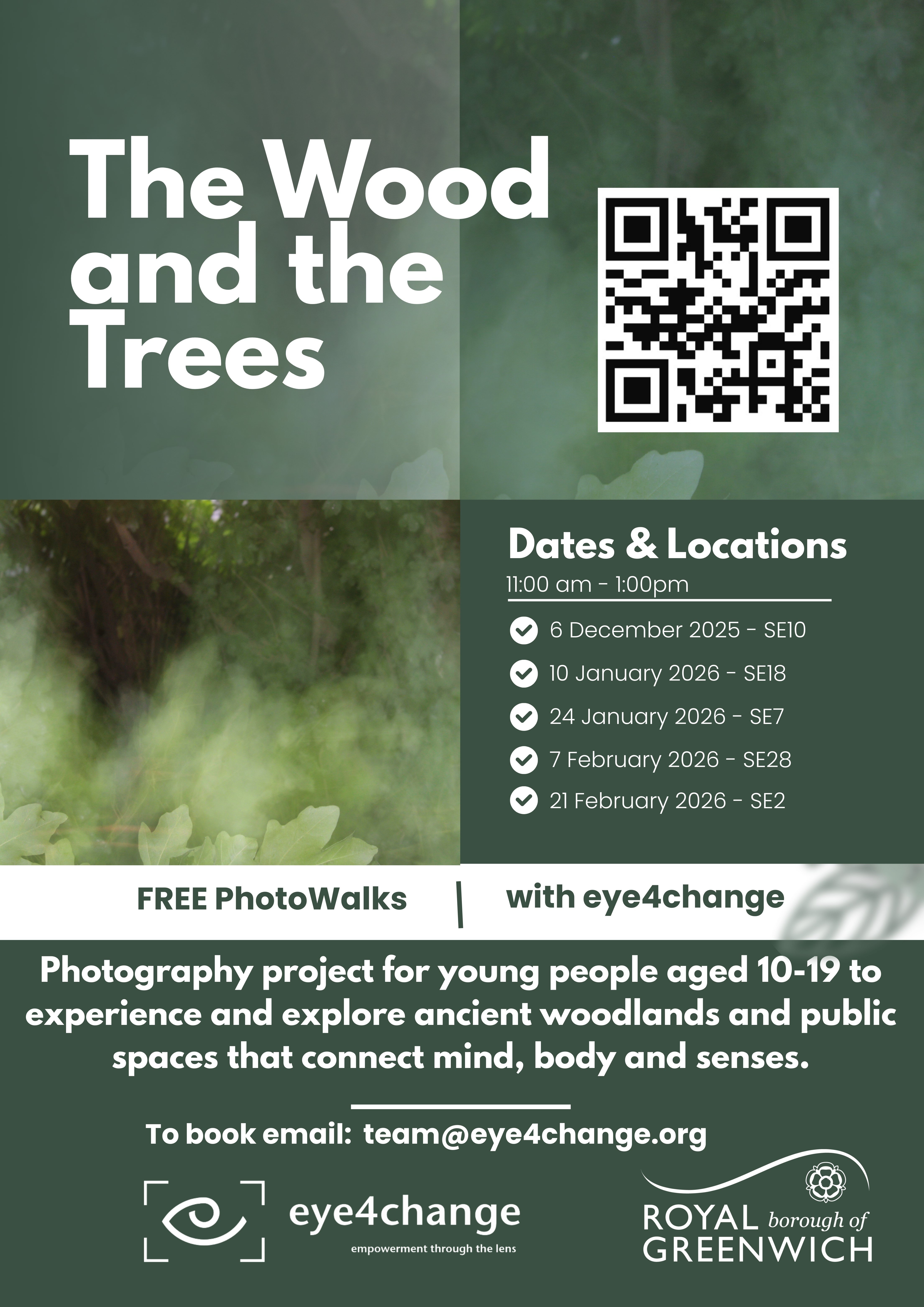 The Wood and the Trees are free photowalks with Eye4Change for young people age 10-19 to experience and explore ancient woodlands and public spaces that connect mind, body and senses. Locations SE10, SE18, SE7, SE28, SE2 To book email: [email protected]