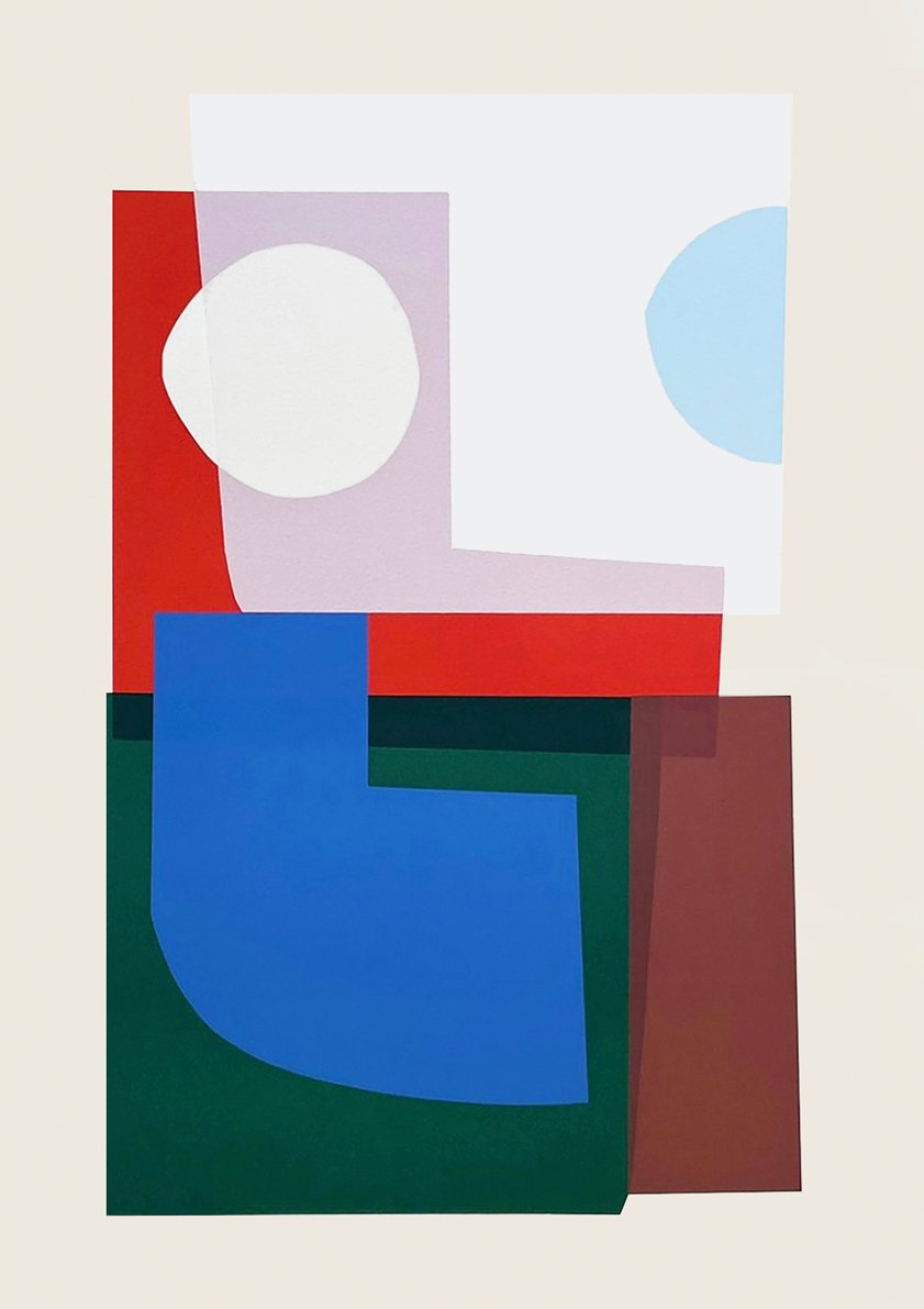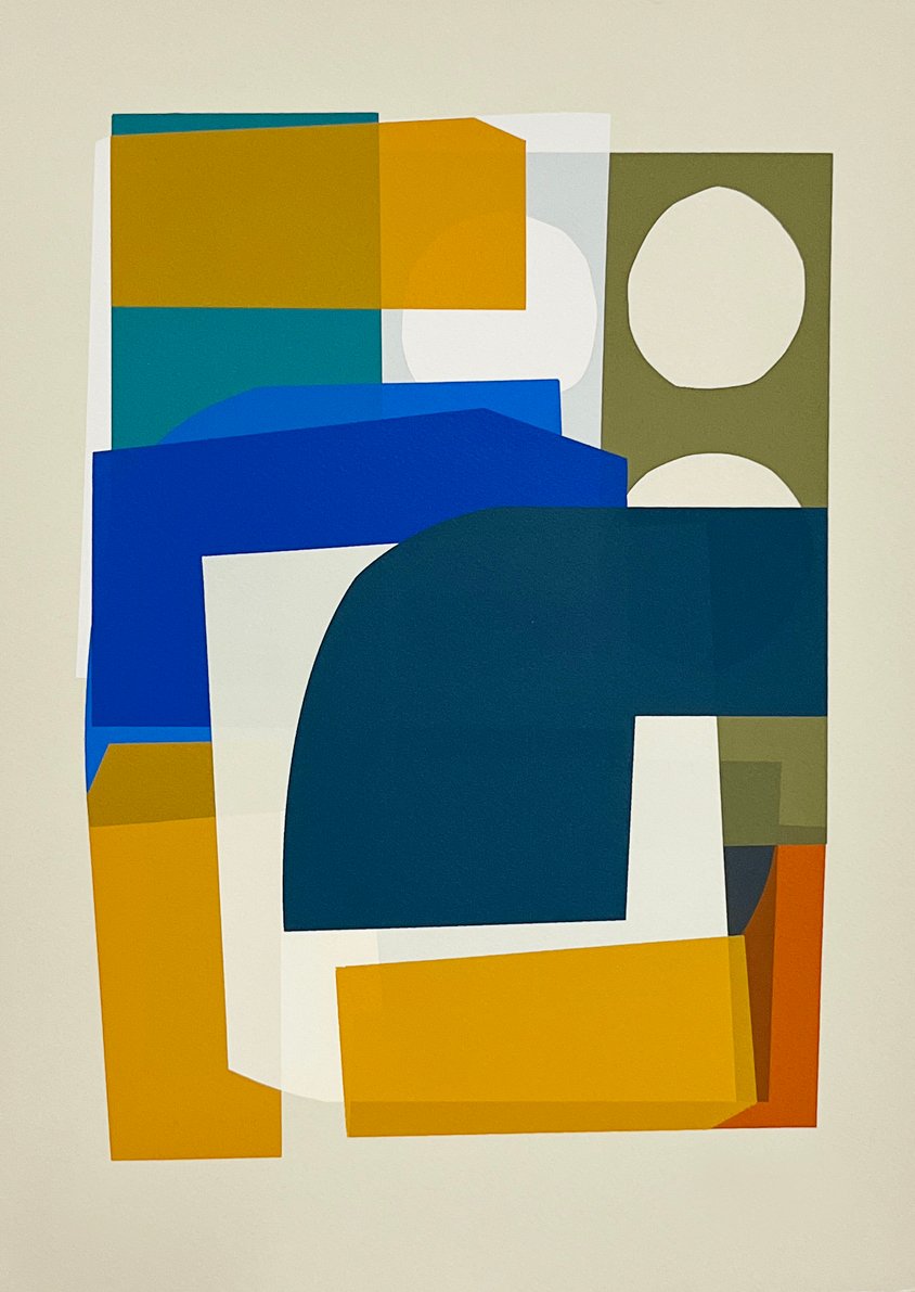 A graduate of Leeds Arts University with a BA in Printed Textiles & Surface Pattern Design (2009), Jonathan spent several formative years developing his practice in Berlin before returning to the UK. His distinctive visual language is defined by layered shapes, intricate patterns, and a rhythmic interplay of colour and form. Abstract compositions form through an organic, process-led technique that embraces experimentation and evolves through the act of screen printing.