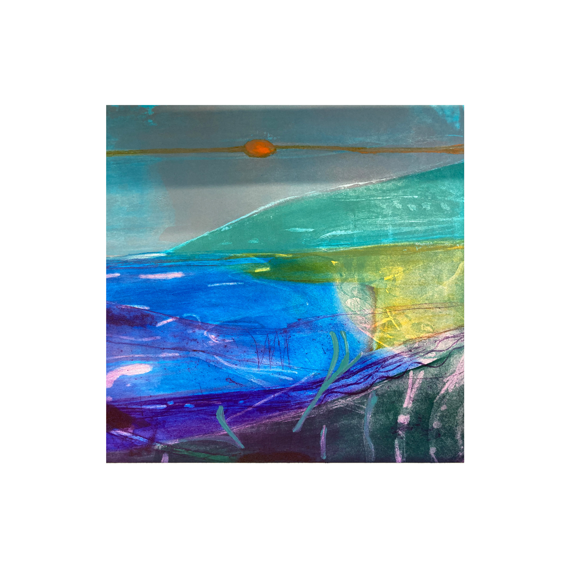 She uses vivid colour as an intuitive response to landscape. Her technique involves using deep velvety tones that contrast with delicate, spontaneous etched lines and textures. This technique is a vital tool for her to describe the light and atmosphere of a particular place, making it tangible to the viewer. This loose imagery and semi-abstract taps into the viewers shared memory of the landscape.