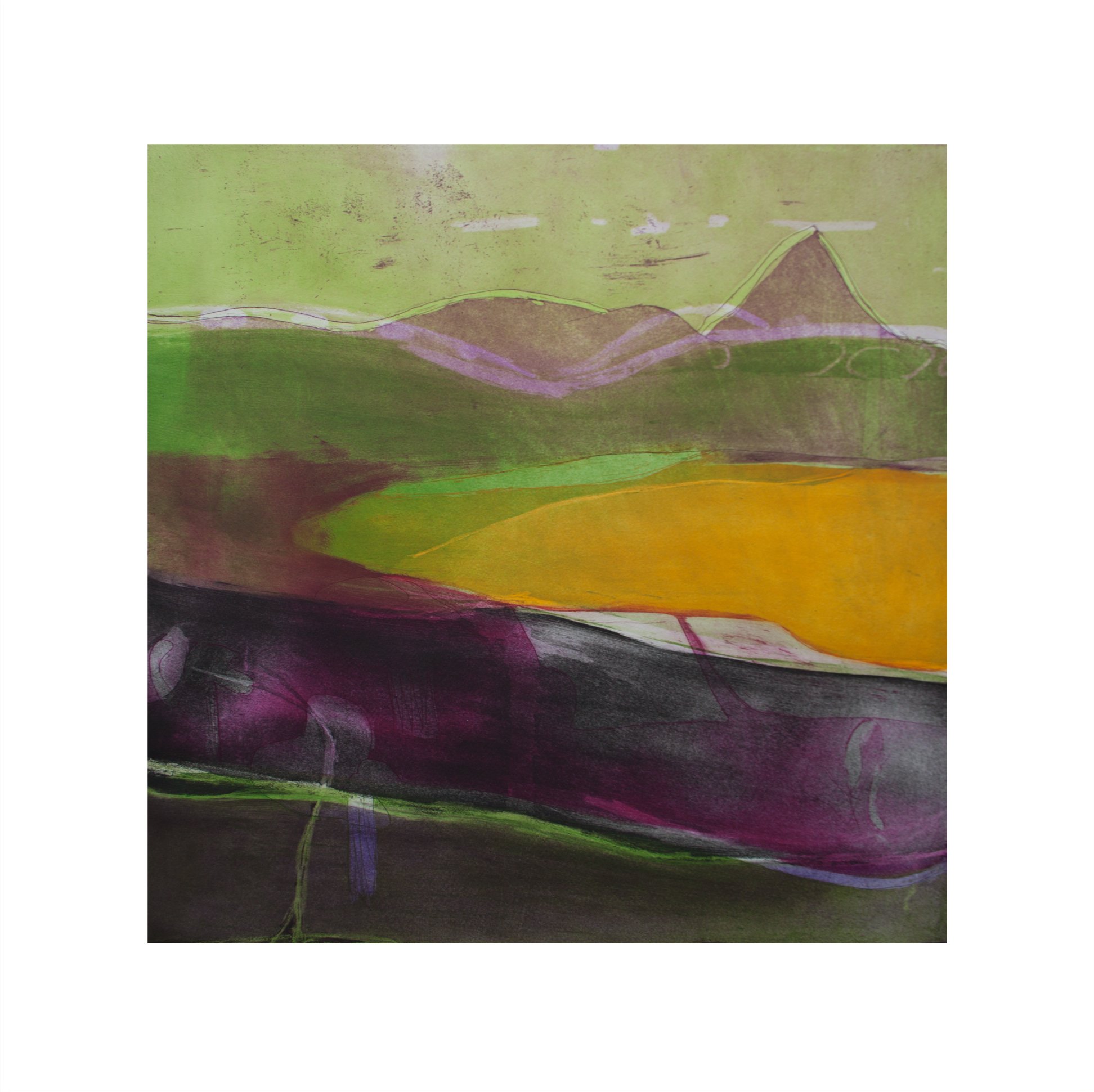 She uses vivid colour as an intuitive response to landscape. Her technique involves using deep velvety tones that contrast with delicate, spontaneous etched lines and textures. This technique is a vital tool for her to describe the light and atmosphere of a particular place, making it tangible to the viewer. This loose imagery and semi-abstract taps into the viewers shared memory of the landscape.