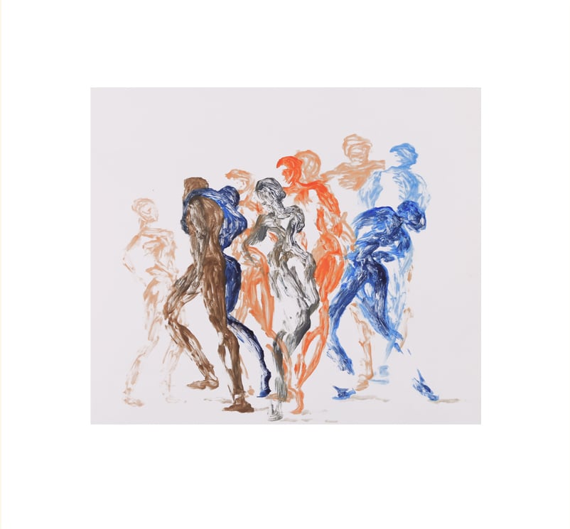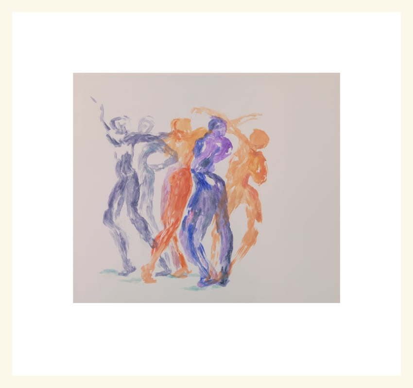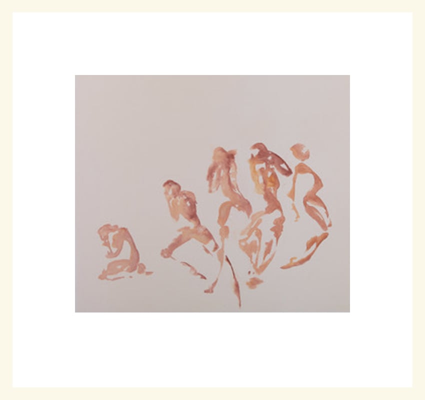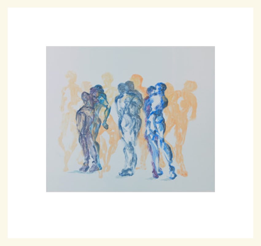 The moving figure, rhythm and energy are central to Sally McKay’s practice. Focusing on live performance and rehearsals, principally dance as her stimulus, she captures fleeting moments of movement through sketching figures in real time. The drawings and paintings made in front of the dancers in movement, inform her printmaking practice, taking them through to etchings and monoprints.